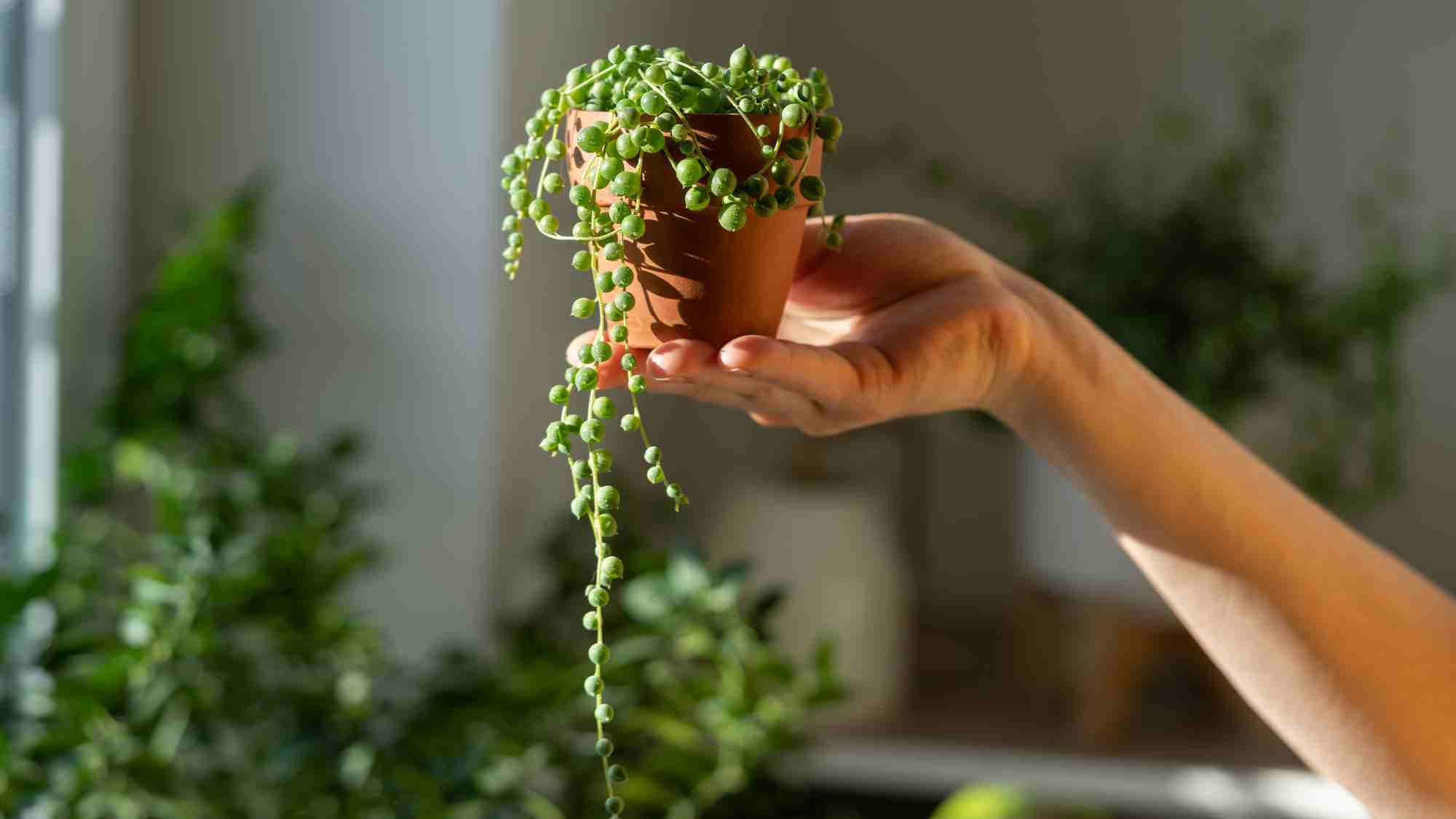 Like other succulents, string of pearls use their fleshy leaves to hold onto moisture and resist drought, and they don’t need to be watered often. In fact, string of pearl plants can quickly develop root rot in soggy soil and die away. To avoid issues, grow these plants in bright light, water sparingly, and keep them away from your “furry friends”—they’re toxic to pets!