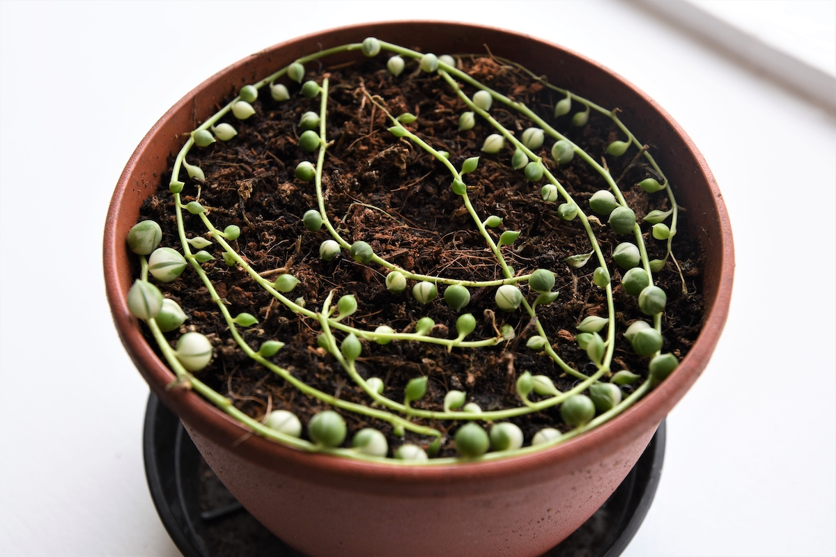 - To repot your plant, add several inches of potting soil to the base of your new growing container, locate your string of pearls in the pot so that it’s at the same depth it was growing in its old container, fill in any empty space with more potting soil, firm the soil around your plant’s roots, and water well to help your string of pearls settle in.