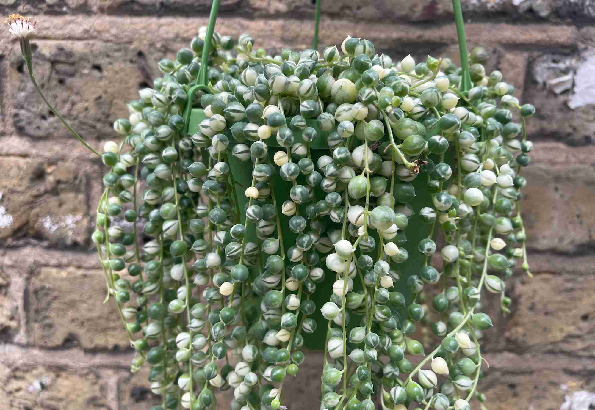 A variegated strings pearls plant:Senecio rowleyanus variegataCredit: Parijatplant