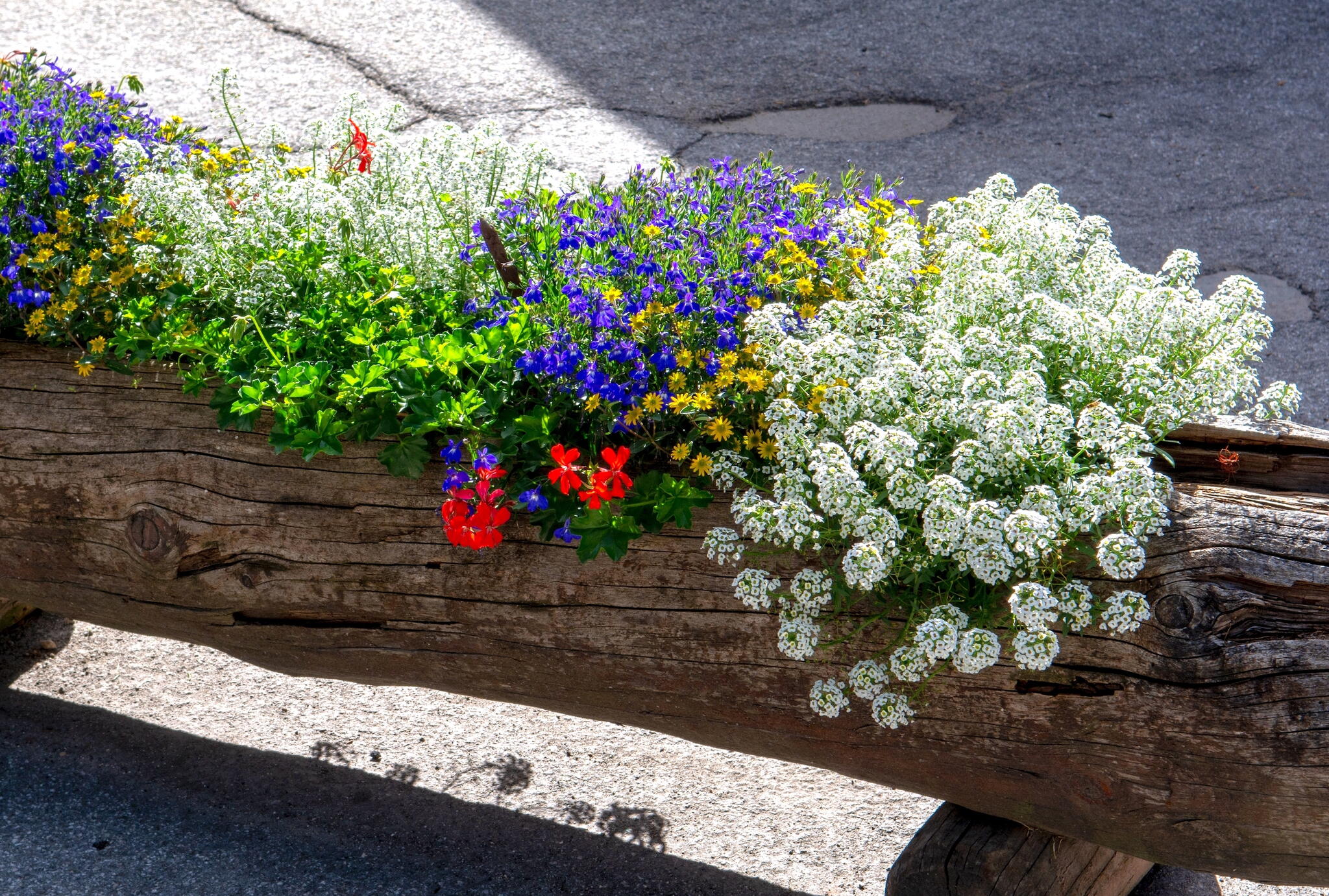 Sweet alyssum and other annuals in a hollowed tree trunk. Dolomites, Italy. Credit: Stefan_Sutka