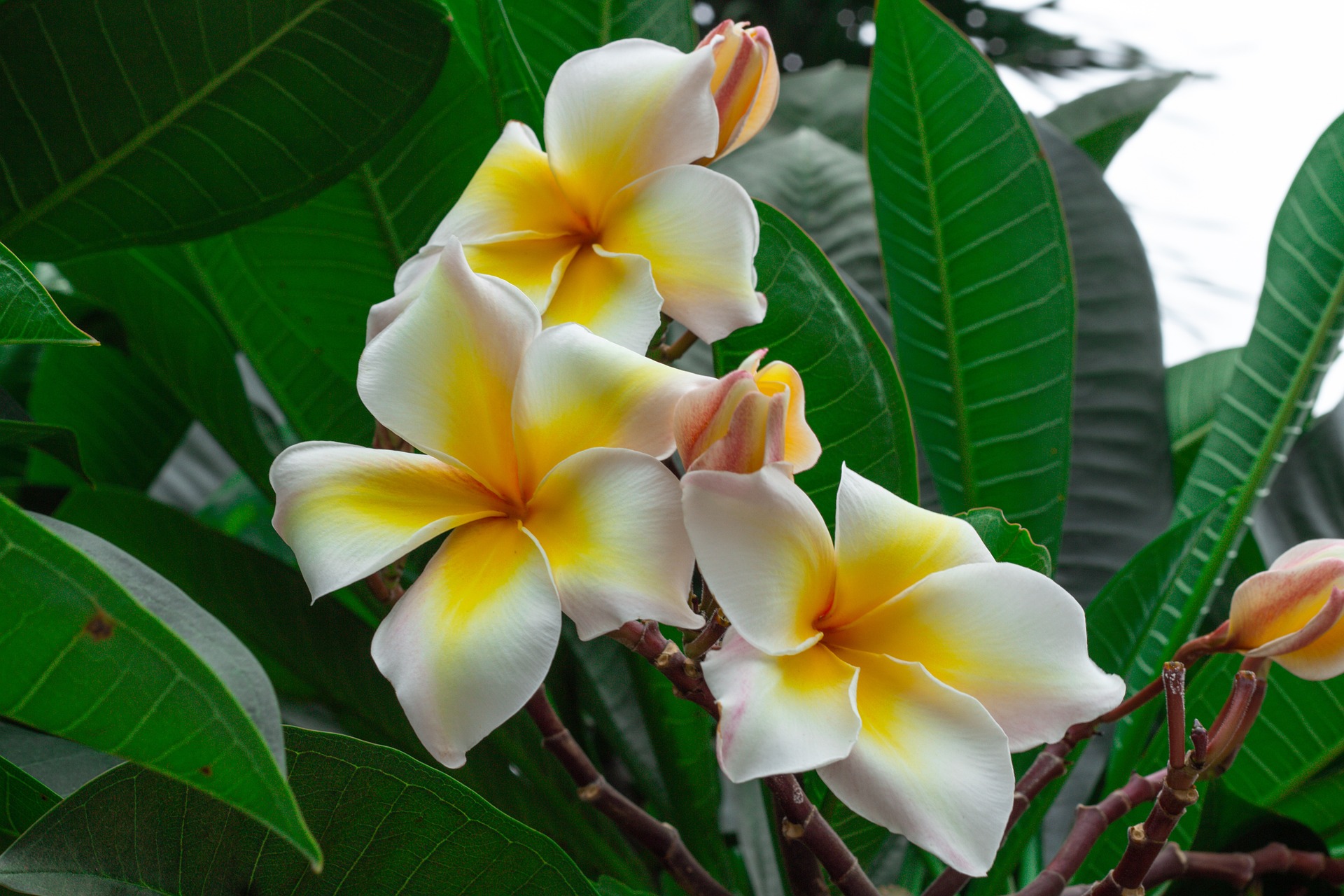 Leaves of plumeria grow in clusters at the tips of the branches and are alternate. They are elongated, with prominent veining, and can be either rounded or pointed at the tip. Flowering begins in early summer and continues into autumn.